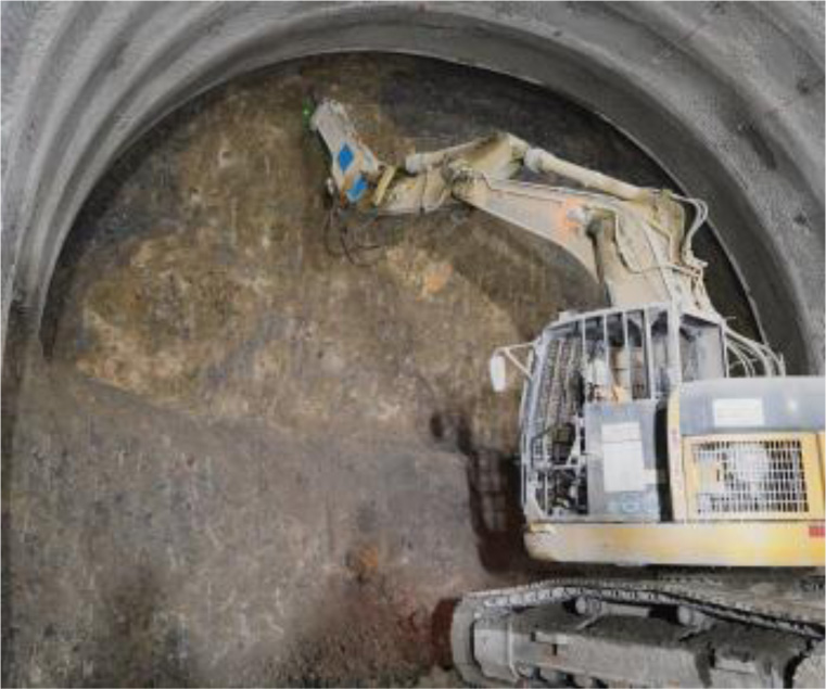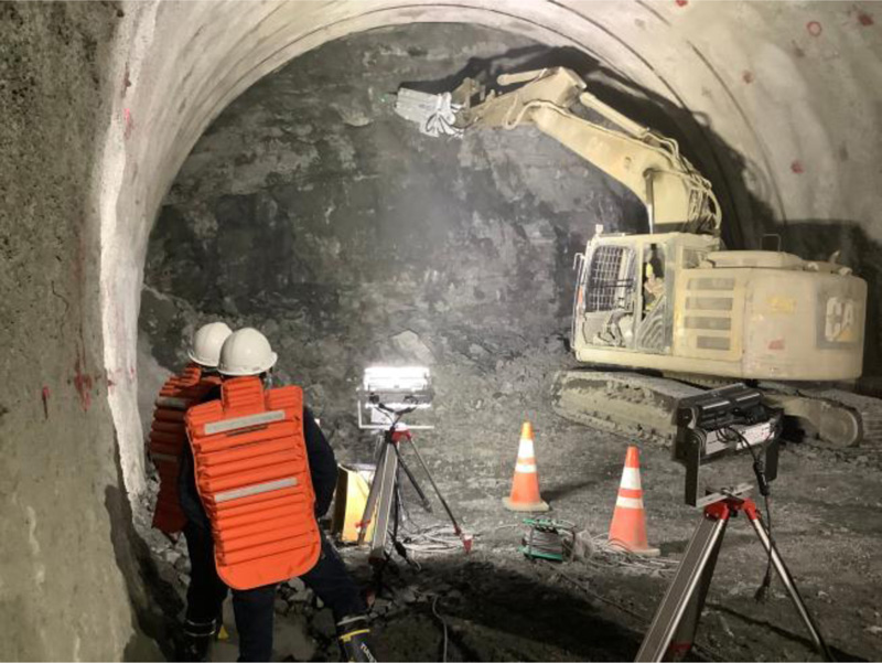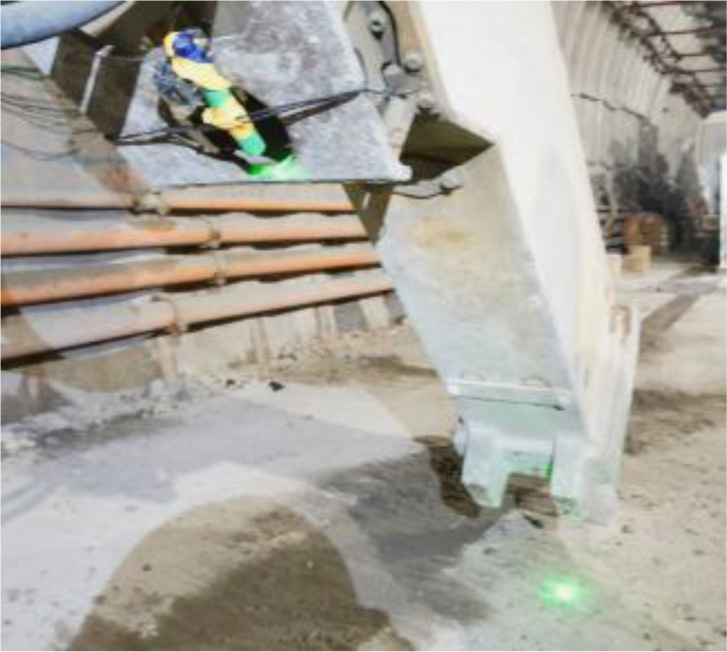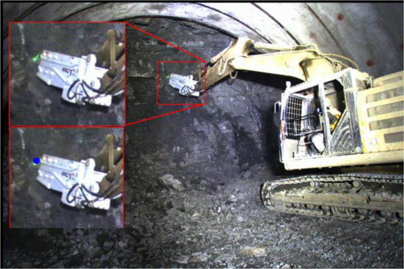 In 2.1.1, it was mentioned that the extracted moving objects on the tunnel face consisted of rockfalls and excavated soil. The excavated soil fell from the drill tip of a heavy machine. Therefore, as shown in Fig. (6), a single-color laser was installed to identify the tip of the drill in the heavy machine. During drilling, the single-color laser irradiated the tunnel face in contact with the drill tip, as shown in Fig. (7).