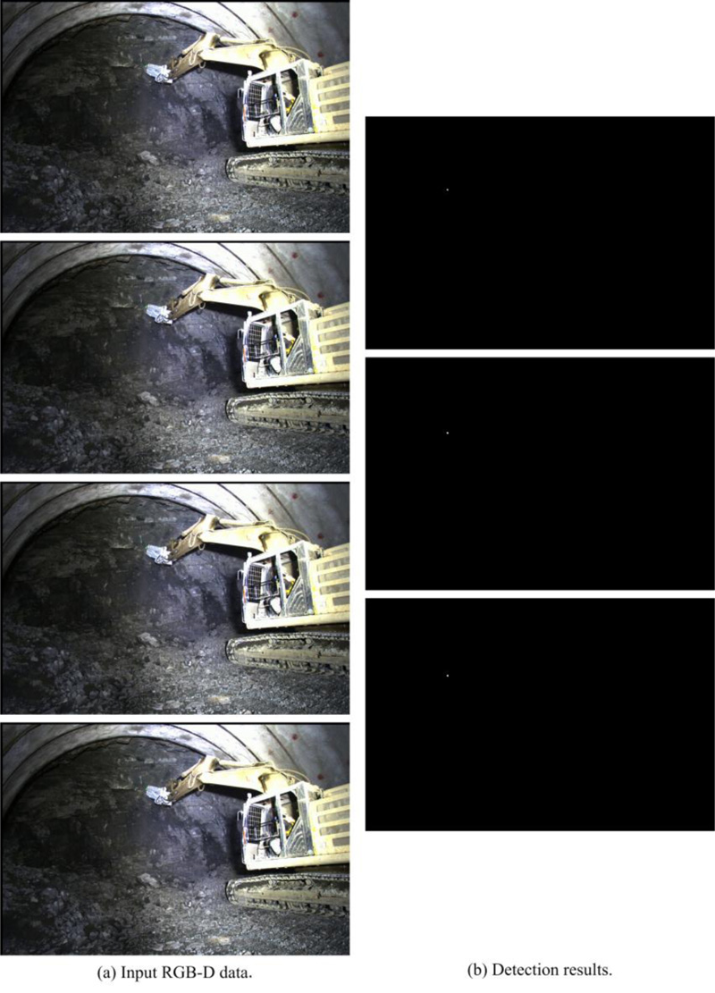 Fig. (19) shows that the single-color laser and its estimated position are coincident. Therefore, it was confirmed that the rockfalls and excavated soil could be separated. From Figs. 17 and 18), it was confirmed that the proposed method could only detect rockfalls by identifying the excavation location in an environment with various moving objects. The conventional method using a laser rangefinder could only capture depth changes at a single point, but the proposed method makes it possible to detect rockfall in two dimensions on the tunnel face. And by extracting the tunnel face using depth data for each frame, the problem of narrowing the monitoring area and detecting heavy machines is solved. The pixel size of the rockfalls in the image of the detection result was 40 pixels, which is 52 mm × 71 mm based on the spatial resolution of the image, which could detect rockfalls. The spatial resolution size per pixel at a distance of 10 m between the tunnel and the camera in the experiment is 10 mm x 9 mm. The proposed method uses a median filter to remove noise, and blocks of pixels smaller than 15 pixels are removed. Therefore, the detection limit size in this experiment is blocks of 15 pixels, which is 30 mm x 44 mm. If the distance between tunnel cameras increases, the spatial resolution will decrease, and the detection limit size will increase. Also, the larger the filter size, the larger the detection limit size, and vice versa. Increasing the resolution of the camera improves spatial resolution and allows smaller objects’ detection, but increases computational cost. To capture smaller rockfalls, it was necessary to increase the resolution of the camera. The brightness of the light illuminating the tunnel face where the experiment was conducted, was approximately 80 lx, indicating a dark environment. In general, images taken with a high-resolution camera in a dark environment will contain a significant amount of noise. Therefore, the noise cannot be completely removed by the median filter and may also be detected as falling rocks. In other words, the detection limit size depends on the distance from the camera to the tunnel face, the resolution, and the filter size of the median filter. In addition, when the shooting distance is extended, the accuracy of the depth data measurement is expected to affect the accuracy of tunnel face extraction. Experiments have confirmed that adequate tunnel face extraction can be achieved at a shooting distance of 10 m. However, when the distance exceeds 10 m, just a portion of the tunnel face may be extracted . Therefore, it is considered necessary to change the equipment used to acquire depth data according to the shooting distance. For example, LIDAR and TOF cameras could be considered, but their equipment is more expensive and has a lower resolution than the stereo camera used in the experiment.