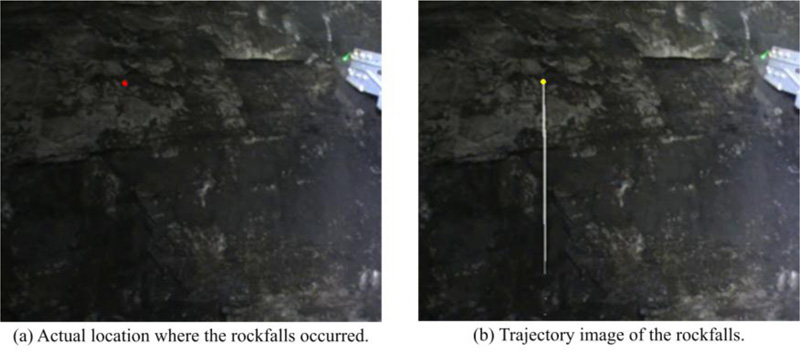 It was necessary to investigate the sizes of rockfalls that had impacts on industrial accidents and tunnel collapses to determine the necessary sizes of rockfalls that could be detected. Industrial accidents occurred due to relatively large rockfalls with an average size of 1000 mm x 600 mm, showing that the proposed method could detect smaller-sized rockfalls. It is generally accepted that sporadic occurrences could cause a collapse when it comes to rockfalls as a precursor to tunnel collapse. One aspect is that these decisions are made based on the workers' intuition and years of experience. Rockfalls from the top of the tunnel face have been linked in the field to pressure from the tunnel's top and extrusion displacement, among other factors. Therefore, it is necessary to determine the number of times and the size of rockfalls from the top of the tunnel face. The trajectory generated by the proposed method and the location of the rockfalls coincide, indicating that the location of the rockfalls is properly identified.