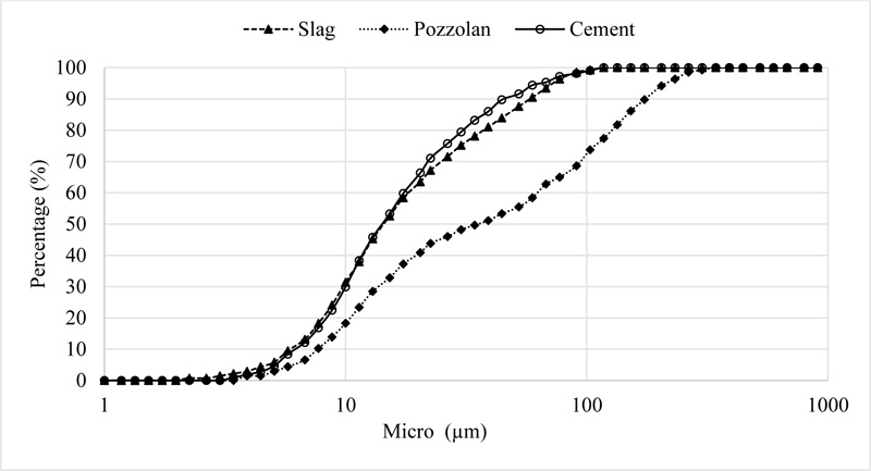 In this study, cement (C) type CEM II / B 42.5 with a fineness of 415.5 kg/m2 was used. Its chemical composition is given in (Table 1). The repair mortar was prepared in the laboratory and contained by weight of cement, either 15% blast furnace slag (SL) or natural pozzolan (PN). The SL used was a granulated blast furnace slag from a local steel factory, and PN was from a local quarry of volcanic rocks. Both PN and SL were ground in the laboratory to a fineness of 350 m2/kg. The particle size curves of cement, slag, and pozzolan are shown in Fig. (1). The particle size distribution was determined by the laser particle size method based on the deflection and scattering of a laser beam striking a particle according to ASTM B-822-10 standard [32]. The chemical compositions of these mineral additions are shown in (Table 2). A superplasticizer (SP) based on a polycarboxylate called MEDAFLOW 30 was used. For the purpose of comparison of formulated repair mortars, three commercial ready-made repair mortars were used. They were repair mortars without fibers called Granipan-R03 (GRA-R03), a polypropylene fibers mortar called Granipan F30 (GRA-F30), and acrylic fibers called MASTER EMACO S488 (MA-EM-S488). The water/binder (W/B) ratio was set at 0.5 for all mixtures to obtain a plastic mortar.