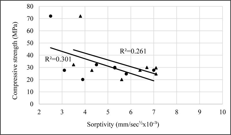 Relationships between the compressive strength and the sorptivity of small and large pores are shown in Fig. (10). There is a trend for the compressive strength to decrease with an increase in sorptivity. Nevertheless, the correlations obtained are poor, with regression coefficients (R2) of 0.261 and 0.301 for small and large pores, respectively.