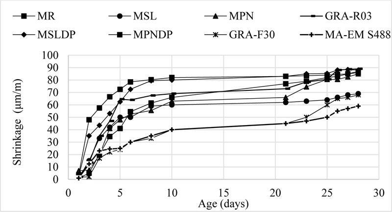 Fig. (11) shows the development of the total shrinkage for repair mortars. Substitution of 15% cement by slag and natural pozzolan resulted in a reduction in total shrinkage of 21% and 2% compared to MR, respectively. This can be attributed to the densification of the microstructure. In addition, slag and natural pozzolan are known to reduce the pore size and connectivity of voids, which slows down the water evaporation and restrains the shrinkage. Slag and natural pozzolan reactions are slower than cement, which ensures a surplus of water available for clinker reaction lowering the autogenous shrinkage. It has been reported that the use of slag in mixtures led to a reduction in shrinkage [39] and that the incorporation of 15% slag resulted in a 37.5% reduction in drying shrinkage values compared to reference mortar [46]. Furthermore, the hydration kinetics of slag mortars has a significant influence on autogenous shrinkage [47]. However, different tendencies were reported by other researchers. Hu et al. [48] reported that the autogenous shrinkage of cement mortars gradually increased with the decrease in the w/b ratio, which is more significant for samples containing fly ash and slag. Dellinghausen et al. [49] also reported that the partial replacement of cement with blast-furnace slag for concrete with an equal w/b ratio and curing period exhibited higher total shrinkage values compared to the same mixtures made with grey Portland cement. The incorporation of date palm fibers in the mixtures of MPNPD and MSLDP led to a slight increase of 3% and 7% in the total shrinkage compared to the reference mortar, respectively. This means that the inclusion of fiber bridges the shrinkage cracks of mortars. It was also found that the MA-EM S448 mortar exhibited a lower shrinkage than that of the mortars based on date palm fibers; this is probably due to the difference in the type of fibers. The use of fiber mortars stabilizes the shrinkage due to the shape and provides good adhesion of the fibers to the cement matrix, limiting the shrinkage. The reduction in shrinkage could be attributed to refined pore structure from secondary pozzolanic reaction and filler effect of mineral addition. It has been reported that the shrinkage of geopolymers containing 0.05% PP decreased by 38.6% [17]. Pereira-de-Oliveira et al. [13] showed that the incorporation of acrylic fibers in mortar allows a reduction and redistribution of cracks or even avoid them if a more large fibers volume is incorporated at the mortar mixtures. No cracking was observed for acrylic fibers dosage of greater than or equal to 1.17 kg/m3 (equivalent to 0.1% fiber volume). Fig. (12) illustrates the relationship between the compressive strength development and total shrinkage evolution at 28 days of the different repair mortars. This figure reveals that compressive strength and total shrinkage are roughly linearly related. A decrease in shrinkage was observed with increasing compressive strength with a determination coefficient, R2=0.588, which was in agreement with other research studies [50].