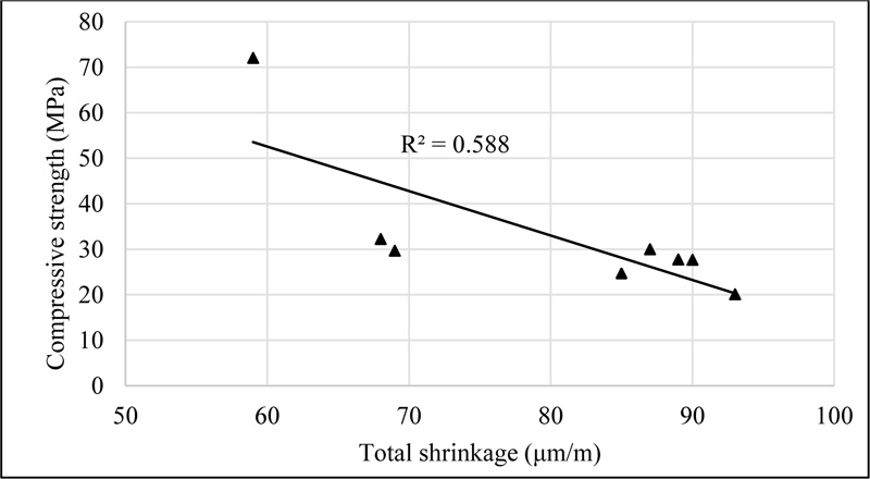- Correlations between compressive strength and water capillary absorption, total shrinkage and pull-off were low.