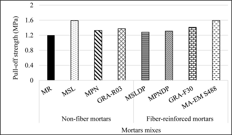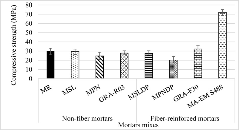 Similar compressive strength is obtained for repair mortar based on polypropylene fiber (GRA-F30) with MR. Repair mortar with natural pozzolan and fibers led to a remarkable drop in compressive strength of 33% compared to MR. This is due to the slow pozzolanic activity of natural pozzolan. In addition, natural pozzolan decreased the flowability of mortar which degraded the uniform fiber distribution, causing a drop in compressive strength. These results are in agreement with those obtained by Benmansour et al. [31], who reported a decrease in compressive strength with the increase in date palm fibers content. However, Soltan et al. [42] and Çomak et al. [43] reported that the natural fibers could improve the mechanical performance of a cementitious matrix as a 2% hemp fiber addition had a positive effect on the compressive strength of cement mortars. On the other hand, Benmansour et al. [31] reported that the density and compressive strength of mortar decreased with increasing date palm fibers content. The maximum compressive strength was obtained for mixes with 5% of date palm fibers. It should be noted that plant fiber, in general, presents a high variation in its mechanical, physical, and chemical properties due to the age of the plant and from where the fibers are extracted and the soil and climate conditions. The shape, morphology of the cross-section of the plant fibers, and their mechanical properties vary with their length [42]. Readymade repair mortar with synthetic fibers presented the highest compressive strength, especially the mortar based on acrylic fibers.