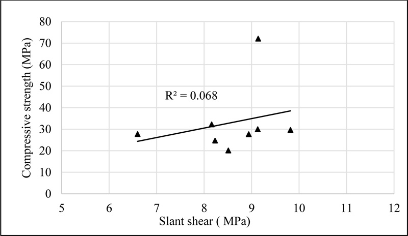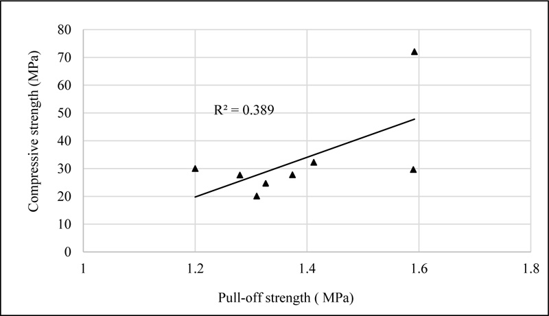In order to predict the bond strength from the experimental values of compressive strength, a linear relationship exists between the bond strength and the compressive strength (Fig. 15). The correlation shows a poor correlation with a regression coefficient R2=0.389.