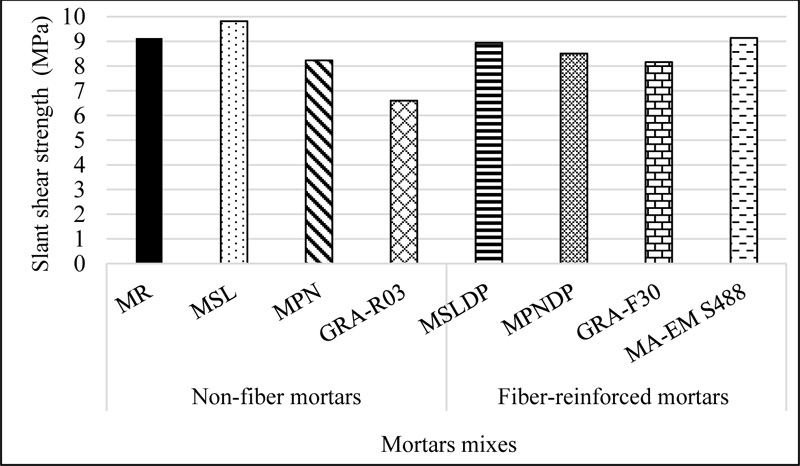 - This study confirmed the benefit of using mineral addition and natural fibers materials as repair to improve the bond strength. Mixes with slag and date palm fibers had an average shear bond strength of 1.59 MPa and 1.44 MPa and slant shear strength of 9.82 MPa and 8.94 MPa, respectively.