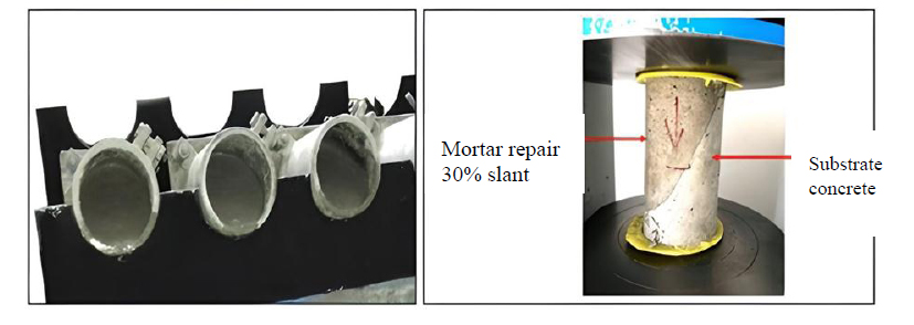 The slant shear test is a suitable method for evaluating adhesion under a combination of shear and compression in accordance with the standard ASTM C 882–05 [38]. The slant shear test is another type of bond test used to characterize the superficial cohesion of the substrate concrete. The composite cylindrical specimens were compression tested at 28 days after application of the repair mortar. The bond stress is calculated using the following equation: