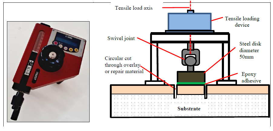 The risk of cracking was assessed by shrinkage tests on prismatic specimens of 40mmx40mmx160mm, and the first measurement was taken after demoulding (24 hours) according to the procedure described in NF P 15-433 [36], and measurements were taken to 28 days. For the pull-off test, the support base concrete slabs used in this study were of grade C25/30. The pull-off test characterizes the bond of repair materials as the bond strength is compared to a minimal value for structural repair.