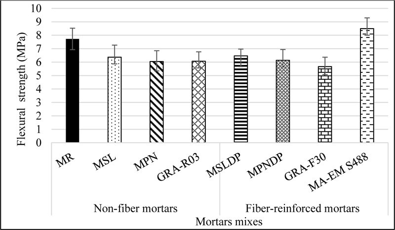Flexural strength results, presented in Fig. (6), show that the incorporation of mineral additions (SL and PN) decreases the flexural strength by 18% and 22%, respectively, compared to control mortar. This may be attributed to the pozzolanic hydration process, which is low. It can be seen from this figure that the use of a non-fiber repair mortar GRA-R03 leads to a reduction of 21% compared to MR; these results are very comparable to those with mineral additions. In the case of fiber mortars, a slight increase in flexural strength was observed for mortars MSLDP and MPNDP in the order of 3% compared to MSL and MPN at 28 days, respectively, but the flexural strength did not reach that of reference mortar. This is probably due to the pozzolanic effect of additions, which develops less quickly at early ages and due to the contribution of date palm fibers to the reduction of cracking. A comparison of the failure of samples of non-fiber and that of fiber repair mortars shows that the latter has a more ductile character during failure, which would indicate that the sample remains, after failure, attached to the fibers. On the contrary, Kesikidoua and Stefanidoua [44] showed that the behavior of natural fibers (jute, coconut, and kelp) of the same length in cement mortars led to an increase in flexural strength.