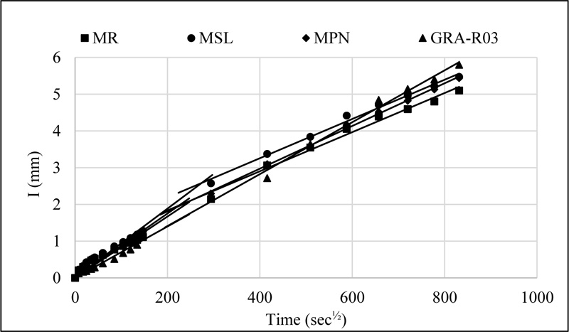 The mechanical performance of the repair mortar was assessed by the compressive strength and flexural tensile strength, which were performed according to EN 196-1 [33]. The durability was assessed by the water capillary absorption test, which was measured on cubic test specimens of 100x100x100 mm3 preconditioned according to the recommendations of the procedure of ASTM C1585-11 [34]. The test is a good indication of the porosity and water permeability of the material and hence its resistance to penetration of aggressive water environments. Before each test, specimens were removed from the container, wiped with a sponge, weighed and then returned to the container. The testing time used are as follows: 1min, 5min, 10min, 20min, 30min, 1h, 2h, 3h, 4h, 5h, 6h, 1 day and then every day for up to 8 days. Sorptivity values of the repair mortar mixtures were obtained from the results of the water capillary absorption.