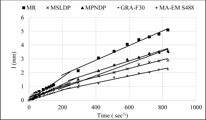 As shown in Figs. (7 and 8), the capillary water absorption rate of the repair mortar samples increased rapidly at the start of the test and decreased as the water moved through the materials. The absorption at the start of the test corresponded to the faster filling of the large pores of the sample near the contact surface with the water and then diffused to capillaries of smaller diameters. The progression of water by capillary action in the mixtures is a function of the distribution of the capillary pores. The results showed that replacing cement with slag or natural pozzolan slightly increased the water capillary absorption rate compared to the reference mortar at early ages. This is due to the effect of the slag, which hydrates slowly and consequently influences the distribution of the pore size of the porous structure. As can be seen from Fig. (7), readymade non-fiber repair mortar (GRA-R03) exhibited a higher absorption coefficient compared to MR for large and small pores. In the case of fiber-repair mortars, lower absorption coefficient values were obtained with laboratory mortar containing slag and natural fibers (MSLPD) for large and small pores with a reduction of 36 and 43%, respectively compared to MR. A reduction of around 25 and 30% compared to MR for the mixtures of MPNPD for large and small pores, respectively, was reported. Water absorption of date palm fibers depends on the fibers' size and their chemical composition (cellulose), as the high cellulose content in the natural fibers leads to increased water concentration [31]. However, using readymade fiber mortars GRA-F30 and MA-EM S 448 led to a significant reduction in absorption coefficients of 51 and 36% for large pores and 55 and 32% for small pores compared to MR, respectively. The lowest coefficient values were given by repair mortar with synthetic fibers MA-EM-S488. This reduction may be attributed to the refinement of the formation of capillary pore with a denser interfacial area in the mixture, as reported previously [30]. Introducing natural, propylene, synthetic or natural fibers in mortars lower the water absorption coefficients compared to non-fiber mortars. This can be explained by the fact that water absorption depends on the specific surface area, the size and tortuosity with which a porous structure is connected and the relative average length of a fluid particle. The water absorption by capillarity of acrylic fibers reinforced mortars was higher than the plain mortar at 7 days, but a slight reduction was observed at 28 days. This behavior corresponds to the formation of pores containing the air that acts as a barrier, preventing the rise of water through the matrix and partially reducing the capillary pressure inside the pores [13]. Moreover, it can be concluded that adding polypropylene fibers to the geopolymer mixture decreased the water absorption in most samples, probably because the fiber particles filled some of the pores in the mixture and consequently reduced moisture absorption capacity [16].