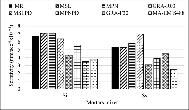 - Absorption values were quite similar for slag mortar and acrylic fibers mortar, which presented the lowest absorption coefficient of 2.88 mm and 2.25 mm, respectively.