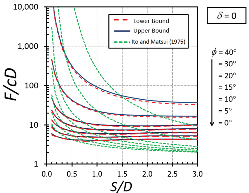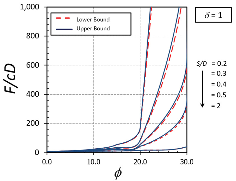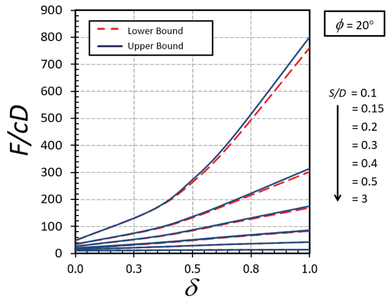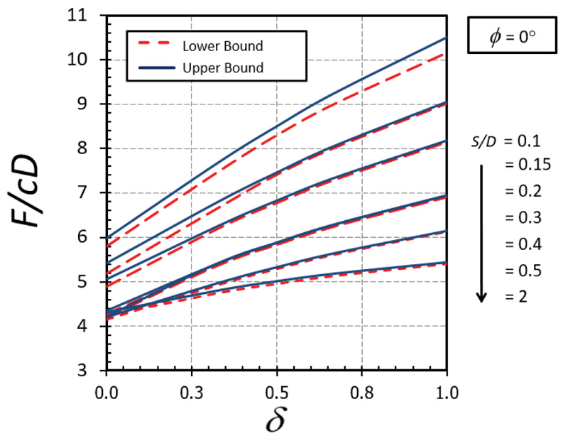 The influence of δ on F/cD is shown in Figs. (10-11) for the cases of ϕ = 0° and 20°, respectively. A nonlinear relationship between δ on F/cD can be found in both cases. It can be seen that the effect of δ becomes significant in determining the magnitude of F/cD when the soil gap is very narrow (that is, S/D = 0.1). Also, the curves of the cases with a small value of ϕ are convex (Fig. 10) while those with a large value of ϕ are concave (Fig. 11). The impact of ϕ on F/cD is depicted in Figs. (12-13) for the cases of δ = 0 and 1, respectively. Clearly, the effect of ϕ on the results becomes very significant when the value of ϕ becomes greater than 20°.
