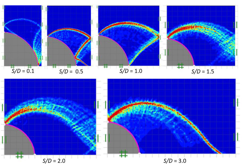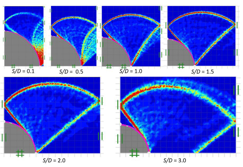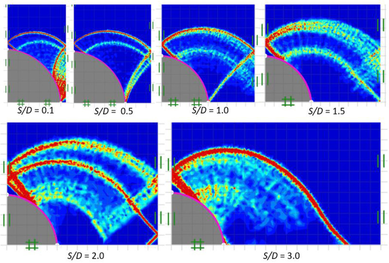 Figs. (14 and 15) show failure patterns which were drawn showing the variation of the power dissipation function from a narrow to a wide soil gap for smooth and rough piles (that is, δ = 0 and 1), respectively, as well as soil friction angle of ϕ = 15° with varying soil gap ratios, S/D = 0.1-3.0. In Fig. (14), a radial shear zone behind the soil gap is substantially confined between stiff piles for a narrow soil gap (S/D = 0.1). A stiff curvilinear triangle zone can be seen behind the soil gap for S/D = 0.5-1.0, which results from an increase in the size of the radial shear zone. Shear bands spread entirely across the free surface of the soil gap as the soil gap becomes wider S/D > 1.0. It is shown in Fig. (15), in the case of a rough pile-soil surface (δ = 1) with the same selected range of parameters, as the soil gap ratio increases, the radial shear zone behind the soil gap also increases and spreads wider, generating a curvilinear triangular arching path.