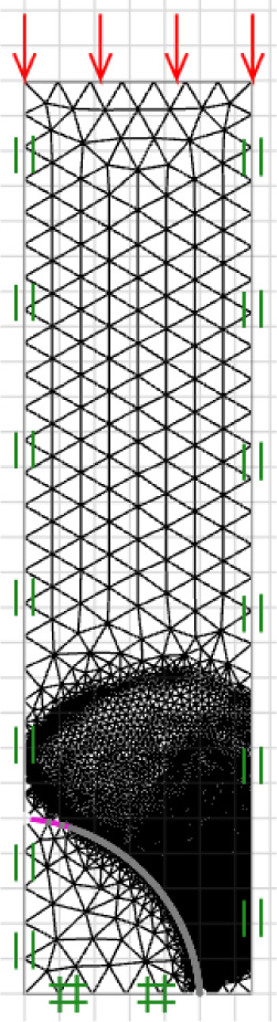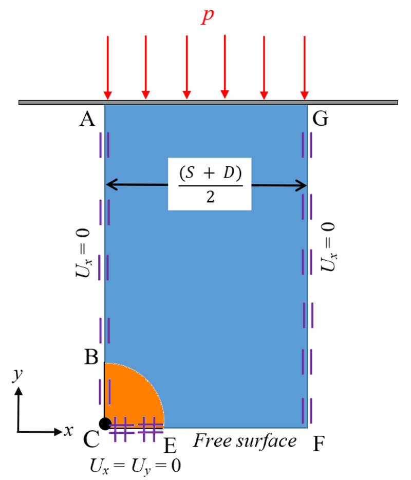 Fig. (2) shows a numerical model of the problem of determining the limiting normal earth pressure behind soil gap under plane strain conditions. The model, which uses only a fourth of the rigid circular piles and half of the soil gaps, is fully prepared using symmetrical circumstances. In both upper and lower bound computations, the soil and pile domains are discretized into a series of triangular elements. A rigid element is assumed to model the pile material without any movements. The circumferential length of the soil-pile interface is described as interface elements, allowing for velocity and stress discontinuities in upper and lower bound computations, respectively. On account of symmetry, the model's left and right boundaries are locked horizontally. A free surface forms the bottom border of the soil gap. Each column pile's horizontal centerline border is fixed in both directions to ensure that the rigid pile does not displace. At the top boundary of the model, a uniform surcharge pressure, p, is imposed and adjusted in both upper and lower bound computations. The failure zone does not touch the top (side) boundary due to the adequate length (length GF in Fig. (2)) of the chosen domain; therefore, the computed limit loads remain unaffected if the length GF is increased. An automatic mesh adaptivity procedure was adapted to develop very accurate upper and lower bound solutions for the limiting pressure behind the soil gap, as illustrated in Fig. (3). Following initial calibration tests, five rounds of adaptive meshing with the number of elements rising from 5,000 to 10,000 were utilized for all the studies. The sizes of the elements were gradually reduced towards/around the region of plastic failure.