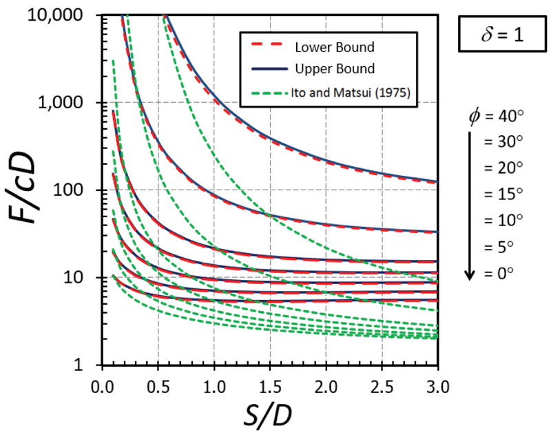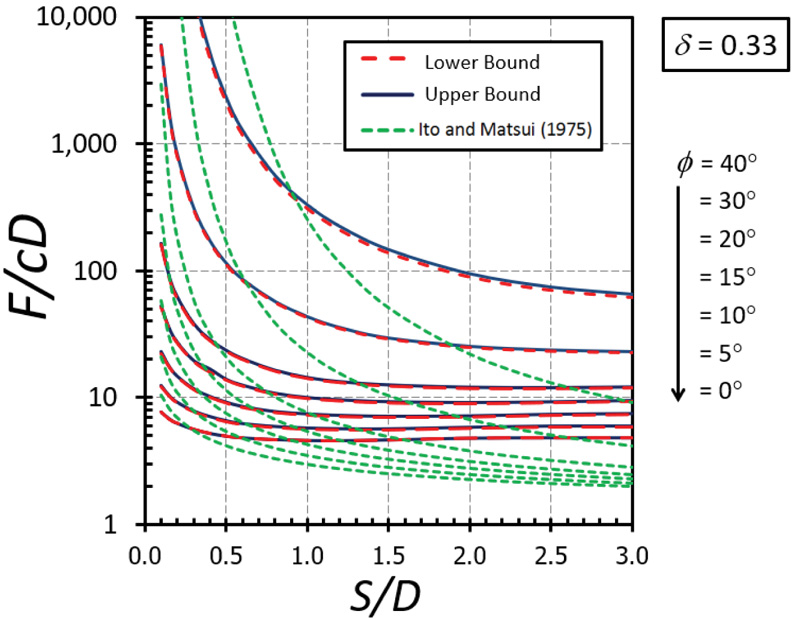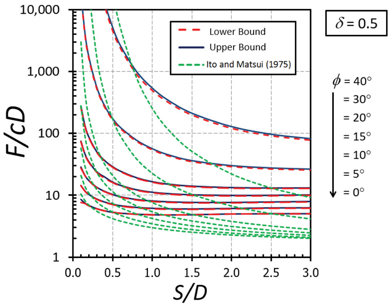 The nonlinear relationships between F/cD and S/D are depicted in Figs. (5-9) for the cases of δ = 0 (fully smooth), 1/3, 1/2, 2/3, and 1(fully rough), respectively. The different curves in these figures correspond to the values of ϕ between 0 and 40°. Note that the value of the F/cD can be accurately bracketed by computed upper (UB) and lower (LB) bound solutions within 3% for all cases. Generally, the magnitude of F/cD reduces dramatically when S/D increases and remains constant thereafter when S/D becomes larger than 2. For a narrow soil gap, S/D = 0.1, the arching effect generates very high values of the F/cD. The solutions of F/cD between the present study and the Ito and Matusi study [21] are also compared in Figs. (5-9) for all cases of the adhesion factor δ. Ito and Matusi [21] used the limit equilibrium method with an assumption of the failure mechanism to predict the solutions based on the force equilibrium. However, their method did not consider the influence of the adhesion factor since the method is developed from the equilibrium of forces acting on the cross-section of piled walls. It is found that the solution provided by Ito and Matusi [21] differs significantly from that obtained from the present analysis; both the solutions, however, generate a similar trend about the effect S/D on F/cD. The solutions obtained from the present study do not involve any assumption about the geometry of the failure surface and, therefore, will provide much more accurate answers. The design charts developed in Figs. (5-9) will be useful for obtaining the limiting lateral pile force factor F/cD for a contiguous piled walls in cohesive-frictional soils which can be employed in practice.