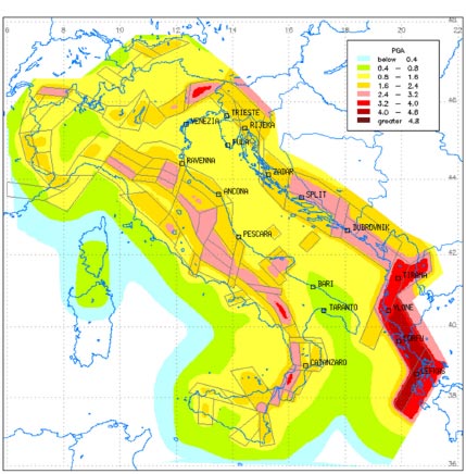 As far as the seismic assessment of offshore slopes is concerned, Peak Ground Acceleration (PGA) values at the bedrock for the area under investigation have been obtained from the seismic hazard map of the Adriatic seabed (i.e., Fig. 10), presented by Slejko et al. [70]. It is worth noting that in order to achieve the maximum accuracy with respect to the spatial distribution of the pseudo-static seismic coefficient, the map provided by Slejko et al. [70] has been digitized to pass all the necessary information into the developed GIS model in a realistic manner. Since the levels of PGA values are classified into certain intervals, an average value for each interval has been considered in each part of the examined region. Moreover, it is evident from Fig. (10) that a part of the examined area for possible pipeline routes near Albania (i.e., southern Adriatic Sea) is located into the zone where PGA is considered equal to 3.6 m/s2 (i.e., medium value in the range of 3.2 to 4.0 m/s2), while the PGA levels are considerably lower near Italy.