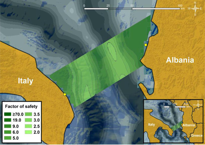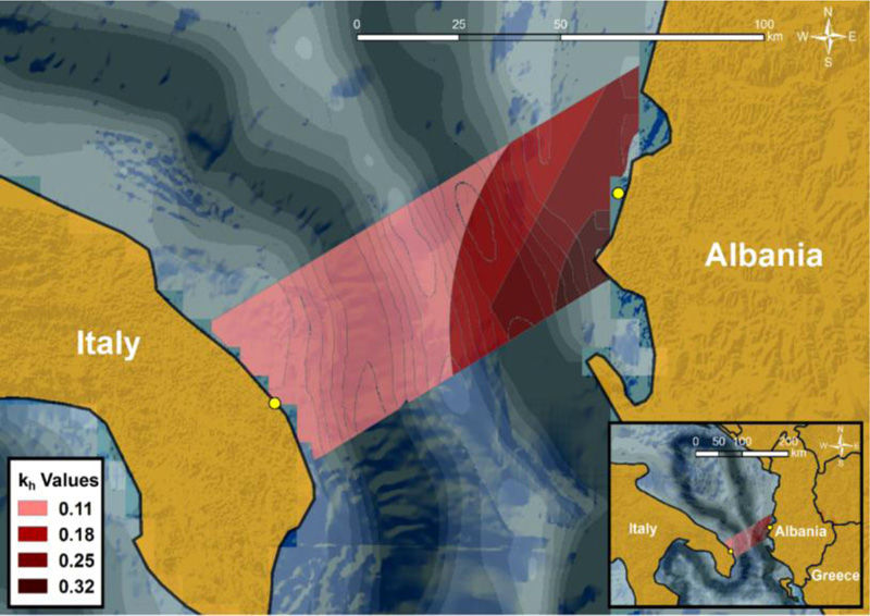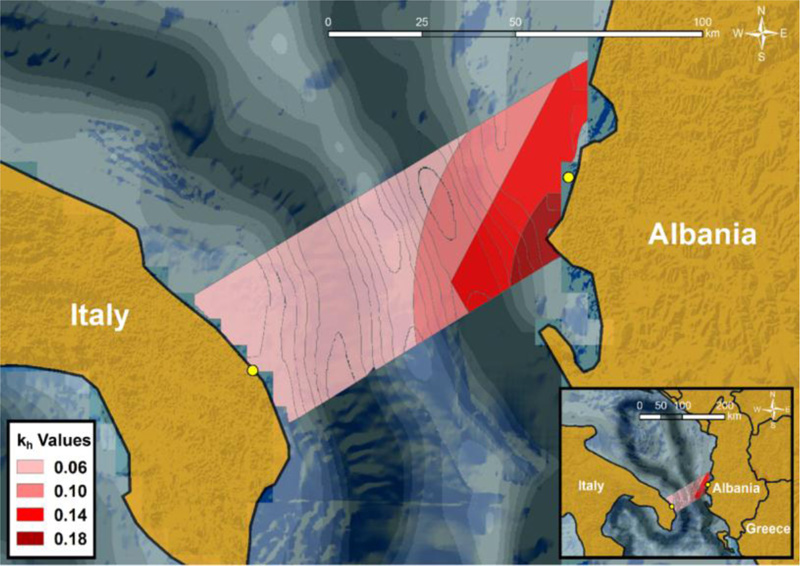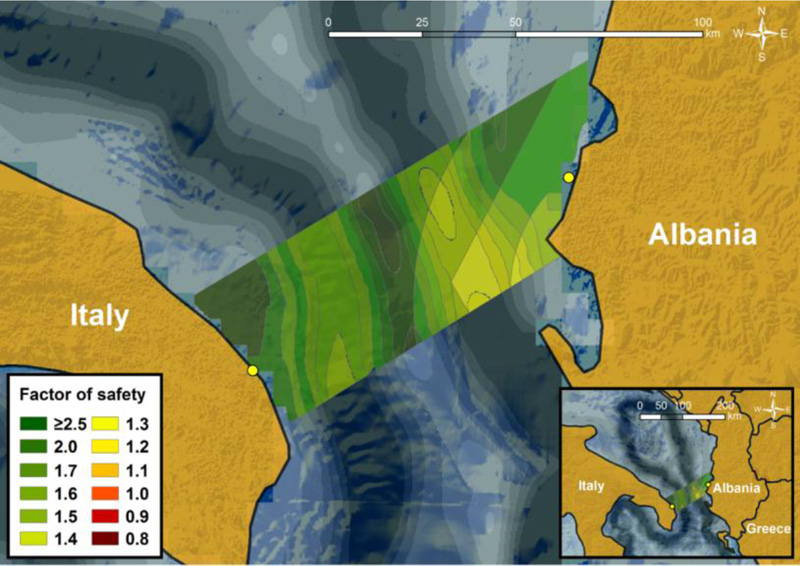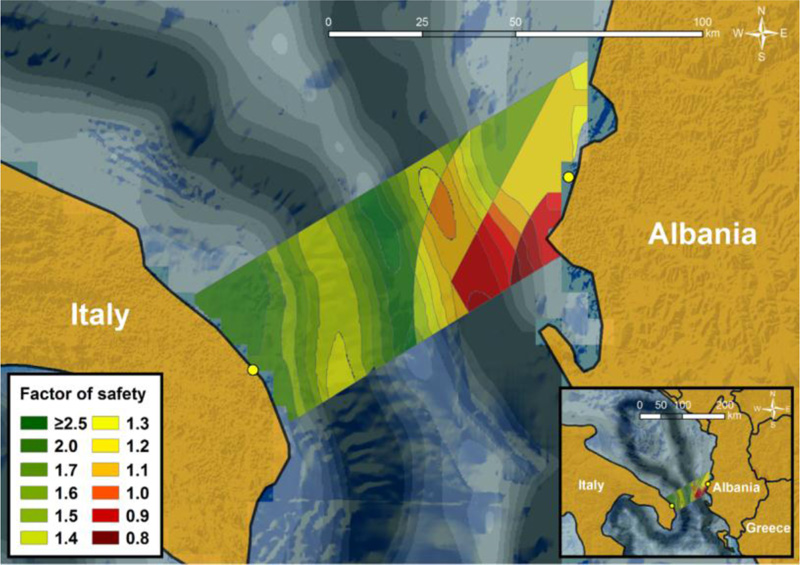 After defining all the necessary parameters, both the pseudo-static seismic coefficients and the associated factors of safety have been calculated into the GIS environment. The maps shown in Figs. (11) to (15) illustrate the spatial distribution of the pseudo-static seismic coefficients and the resulting static and pseudo-static factors of safety for the examined area, i.e., the shaded “trapezoidal” zone among the two points of interest in Albania and Italy. In particular, Fig. (11) presents the factors of safety for static conditions (i.e., kh = 0). It is obvious that all submarine slopes are not prone to failure, since the corresponding factors of safety are significantly higher than 1 for all slope inclination zones. More specifically, factors of safety near the Italian and Albanian coastlines are significantly high and consequently, the relevant slopes can be considered safe. High FS values can also be observed in the plateau in the middle of the Adriatic Sea; however, in the steep zones around the plateau FS values are smaller (i.e., of the order of 2).