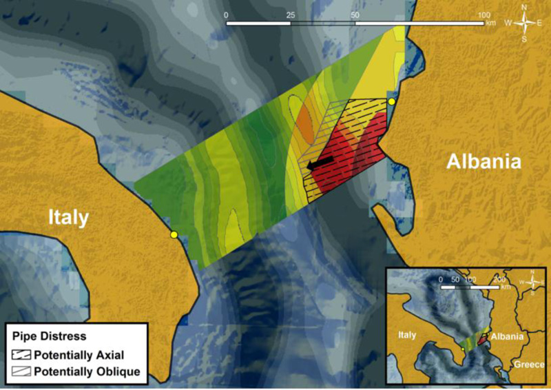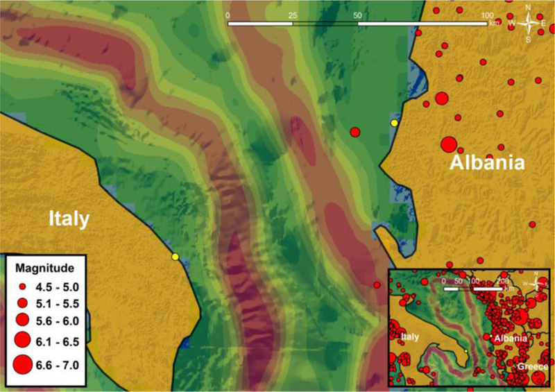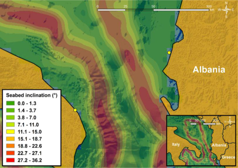 The map in Fig. (7) displays the seabed slope inclination, as it has been extracted through the implementation of the slope tool available in ArcGIS software. Slope inclination has been categorized into nine zones ranging from 0° to 36.2°. The relevant results indicate that the Adriatic Sea is generally characterized by shallow depths and gentle slopes. However, in the southern Adriatic Sea, i.e., at the Strait of Otranto, slopes are steeper and depths are greater, while a plateau is formed at the seabed between the steep slopes which are located at the west, near Italy and at the east, near Albania. Therefore, in conjunction with the regional seismicity, especially near the Albanian coastline (as can be easily noticed in Fig. 8), a pipeline crossing the southern Adriatic Sea could face various offshore earthquake-related geohazards, including liquefaction, seismic fault rupture, and potential submarine landslides [67].