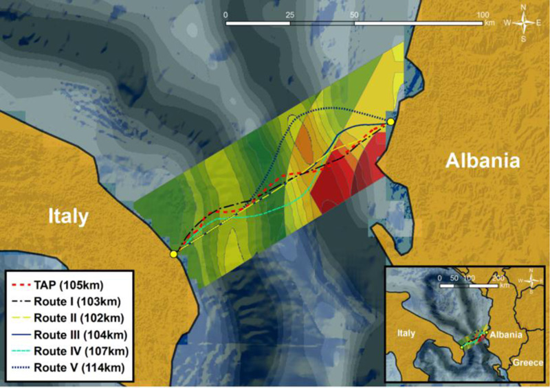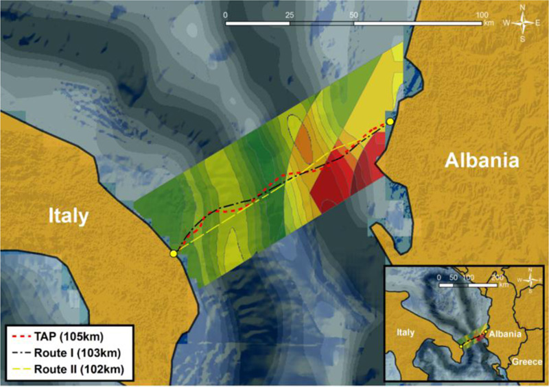 Figs. (17) and (18) present the results of the preliminary routing analysis. It should be noted that the presence of “no-go” areas is neglected in the examined case study, due to a lack of relevant data. Hence, the utilized criteria during the application of LCPA technique are related to cost (and length) minimization, offshore slope inclination and slope stability assessment. Fig. (17) depicts the first two alternative routes that have been derived from the application of the smart decision-support tool: “Route I” and “Route II”, which will be subjected mainly to axial loading in the hazardous zones close to Albania. In addition, Fig. (17) illustrates also the existing Trans Adriatic Pipeline (TAP) route [73], which has been used for comparison with the proposed alternative routes. It can be easily observed that TAP route passes through the specific dangerous zones near the Albanian coastline for tens of kilometers, and consequently, it is susceptible to the geohazard of earthquake-triggered submarine landslides.