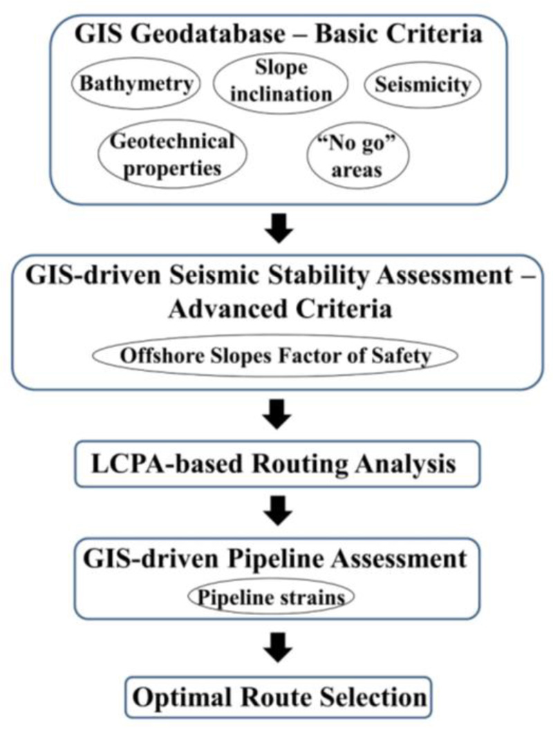 In its present version, the smart decision-support tool semi-automatically combines the LCPA technique with newly developed (semi)-analytical models, in order to select the optimal route of an offshore pipeline, taking into account the pipeline distress due to submarine landslides. More specifically, a large-scale geospatial database that contains all the necessary and available geodata regarding the bathymetry, geomorphology, geotectonics and seismicity of the area under consideration has been created. Subsequently, multiple criteria, have been evaluated utilizing the LCPA technique, leading to several cost-minimized pipeline routes, that correspond to several user-defined scenarios. Moreover, efficient (semi)-analytical models have been utilized to quantitatively assess the structural response of the proposed pipeline routings due to a submarine landslide, and finally, the optimal route is selected. Fig. (2) presents a description of the main steps of the proposed tool, while more details are provided in the sequence.