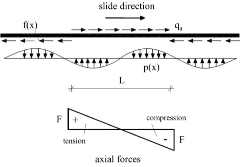 The above force is conservatively assumed to be constant along the landslide length, L, as shown in Fig. (3). The upstream part of the pipeline is in tension, while the downstream part is in compression. The maximum compressive axial force, F, of the pipeline can be estimated in a simplified way by multiplying the axial impact force, qa, with the half length of the submarine landslide, as follows: