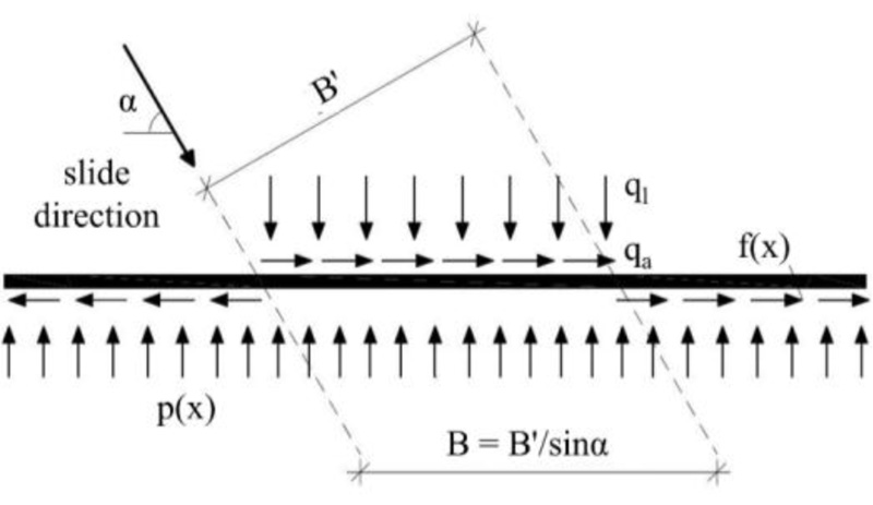 The evaluation of the pipe response for the case of non-exclusively axial pipe loading is based on the semi-analytical model of Chatzidakis et al. [9]. According to the semi-analytical model, the pipeline is assumed to present axial tension and bending, as illustrated in Fig. (4). Although compressive internal forces are not included in the model, compressive stresses are allowed to appear from the combination of axial tension and bending. Note that B’ corresponds to the landslide width, whereas B is associated with the pipe length which is affected by the landslide. For small intersection angles between the pipeline and the landslide (e.g., α < 10°), compressive internal forces may appear, and the pipeline should be examined against global buckling according to section 3.4.1. On the other hand, for vertical intersection of the pipeline with the landslide, B’ is equal to B (B’ = B).