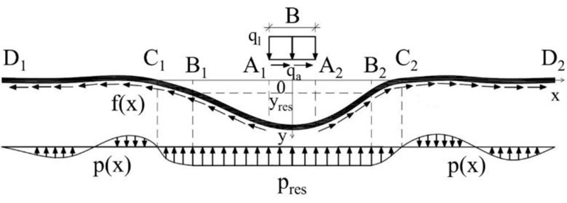 According to the semi-analytical model of Chatzidakis et al. [9], the oblique loading is analyzed in a lateral and an axial component, which are applied concurrently on the pipe. As depicted in Fig. (5), the pipeline is divided into segments depending on the loading conditions. For instance, segment A1-A2 corresponds to the length of the pipe which intersects with the landslide, B, whereas in segment Β1-Β2 the residual lateral soil resistance, pres, is applied. Points C1 and C2 correspond to zero lateral soil resistance, while points D1 and D2 correspond to zero axial soil resistance, f. For each segment, the differential equation for lateral displacements is formulated based on the Euler-Bernoulli elastic beam theory for large deflections.