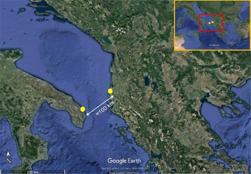 The applicability and the effectiveness of the smart decision-support tool are presented through a realistic case study in the southern Adriatic Sea at the Strait of Otranto, as shown in Fig. (6). In particular, Fig. (6) depicts a satellite image representing the area of southern Adriatic Sea, where the two yellow points describe the origin and destination points, as they have been considered in the current application of the smart tool. The distance between the two points is approximately 100 km. A GeoTIFF format file was downloaded from OpenTopography.org [62], which is an interface for Global Multi-Resolution Topography (GMRT) data [63].