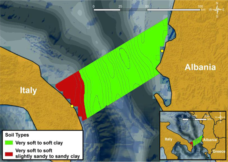 Detailed geotechnical and seismic data of the examined area are essential for the reliable assessment of the offshore slope stability (under static and seismic conditions), and the subsequent application of the smart decision-support tool. Initially, to achieve an accurate geotechnical representation of the seabed, realistic data derived from the geotechnical study of the Trans-Adriatic Pipeline (TAP) [68] have been digitized and added in the GIS database. According to the findings of the geotechnical study, the area of interest is characterized by two main soil types. As illustrated in Fig. (9), the area near the Italian coastline is characterized by slightly sandy clayey soil deposits, whereas the rest of the examined area consists of soft clay. Table 1 summarizes the main soil parameter values (unit weight and undrained shear strength) that have been used in the current investigation. In addition, it is worth noticing that based on the available data, the soil depth has been set equal to z = 4 m, as this is the maximum depth of the (softer) upper layer at the seabed. Obviously, for lower soil depths (i.e., for z < 4 m) Eq. (1) results in lower factors of safety, thus, the considered soil depth of z = 4 m corresponds to the most conservative case. It is noted that the strength profiles of normally consolidated clays in deep water may exhibit a linear increase with depth, a phenomenon that affects the response of a pipeline [69].