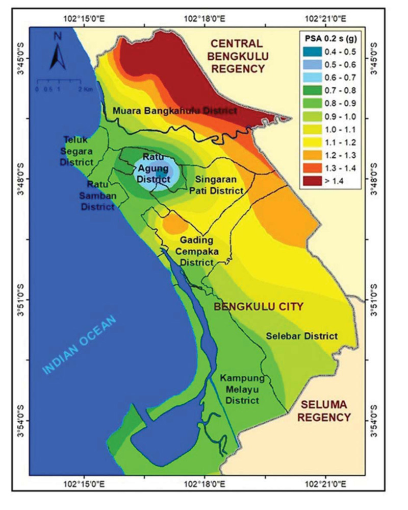 Fig. (10) presents the microzonation map of spectral acceleration at the period of 0.2 (SA at 0.2s). SA at 0.2 is also used to generate spectral acceleration design. SA at 0.2 represents the response of structures for low-storey buildings. Based on Fig. (10), it can be observed that the value of spectral acceleration at 0.2 s is observed to vary from 0.4 to 1.4g. In general, spectral acceleration ranging from 0.9 to 1.2g is dominant in the study area. Several areas with the dominant spectral acceleration are found in Kampung Melayu District, Selebar District, Gading Cempaka District, Singaran Pati District, Ratu Agung District, Ratu Samban District, and Teluk Segara District. Generally, these areas are still located in the coastal area of Bengkulu City, with a distance of only 2 km from the coastline of Bengkulu City. It indicates that in these areas, the response of structures, especially low-rise buildings, is relatively large during the strong earthquake in the study area. This issue is also highlighted by Mase [4], who mentioned that during the Mw 8.6 Bengkulu-Mentawai Earthquake in 2007, spectral acceleration at sites located in the coastal area of Bengkulu City could reach more than 1.0g. In the northern part of Bengkulu City, i.e., Muara Bangkahulu District, the spectral acceleration value is more than 1.4g. In this area, the swamp deposit exists. The formation is dominated by soft and peat soils. Several studies conducted by Mase [4], Misliniyati et al. [36], Likitlersuang et al. [49] mentioned that soil response for a short period tends to be larger at sites dominated by soft soils, such as in Bengkulu (Indonesia), Jakarta (Indonesia), and Bangkok (Thailand). A study conducted seismic hazard analysis under deterministic and local site scenarios [8, 9] suggested that the area in the northern part of Bengkulu City also shows the largest spectral acceleration in a short period. Therefore, based on those previous studies combined with the results of this study, it can be concluded that the area dominated by the swamp area tends to have a large response in a short period.