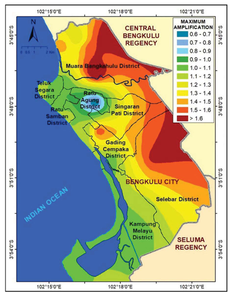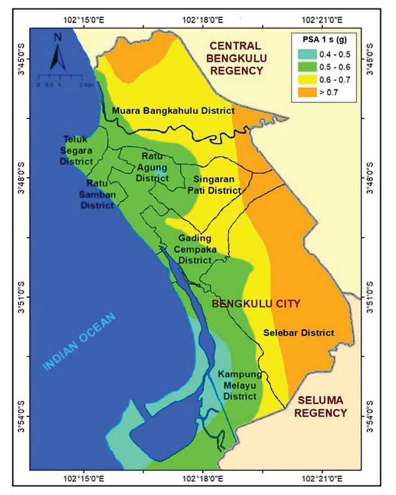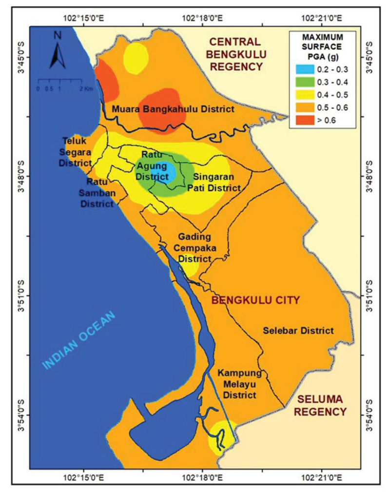 Fig. (9) presents the microzonation map of peak ground acceleration based on a one-dimensional seismic ground response analysis. From Fig. (9), it can be observed that PGA ranging from 0.5 to 0.6g is dominantly found in the study area. The areas dominated by this PGA range are Selebar District, Kampung Melayu District, Gading Cempaka District, Ratu Samban District, Teluk Segara District, and Ratu Samban District. Several small parts of PGA with a range of 0.4 to 0.5g are found in Singaran Pati District, Gading Cempaka District, Muara Bangkahulu District, and Kampung Melayu District. In Muara Bangkahulu District, PGA more than 0.6g is also found. Meanwhile, in Ratu Agung District, small parts of the PGA zone range from 0.2 to 0.4g. In line with the dominant peak ground acceleration in the study area, it can be observed that during the earthquake under a probabilistic scenario, the motion at the ground surface is categorised as moderate to strong motions [7]. It is predicted that the damage intensity level (Modified Mercalli Intensity) in the study area may be about IX to XI [48].