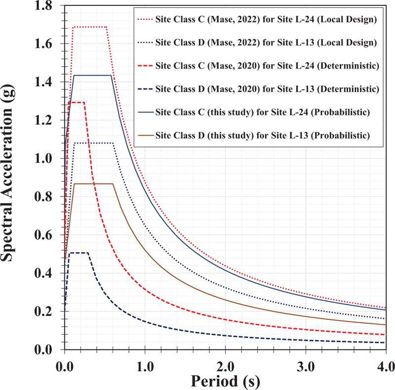To observe the tendency of spectral acceleration design, the spectral acceleration design obtained from this study is compared to other spectral acceleration designs from other approaches, such as deterministic [8] and local seismic [9]. Fig. (13) presents the comparison of spectral acceleration design. In this study, the selected points that are based on previous studies are L-13 and L-24. L-13 represents the point categorised as Site Class D and L-24 represents the point categorised as Site Class C. Generally, both spectral acceleration designs for Site Class C and Site Class D overestimates spectral acceleration design from a deterministic approach but slightly underestimate spectral acceleration design from the local seismic approach. Overall, the spectral acceleration of Site Class C is relatively higher than the spectral acceleration of Site Class D. Based on microzonation map of SA at 0.2 s (Fig. 10), the larger SA at 0.2 s is generally found in the eastern part of Bengkulu City that is dominated by Site Class C. It may be the reason why the spectral acceleration design for Site Class C is higher than the spectral acceleration design for Site Class D. For spectral acceleration design at Site Class D, the tendency of constant peak spectral acceleration is similar to the spectral acceleration design constructed based on local seismic approach [9]. Based on Fig. (11), both spectral acceleration designs show constant peak spectral acceleration at a period of 0.12 s to 0.6 s. The same tendency for both spectral accelerations is also shown by peak constant spectral acceleration at a period of 0.11 to 0.59 s. Therefore, it can be concluded that the spectral acceleration design obtained from the probabilistic approach emphasizes on low to medium period in which it is related to the low to medium-rise buildings [4]. In Bengkulu City, the limitation on the allowed number of stories for the building is still enforced. In line with this study's finding, using a seismic hazard map can be relevant to compose spectral acceleration design for Bengkulu City.