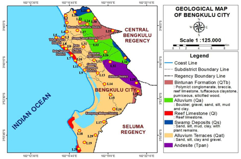 Fig. (2). Geological map of Bengkulu City (modified from Mase, 2022).