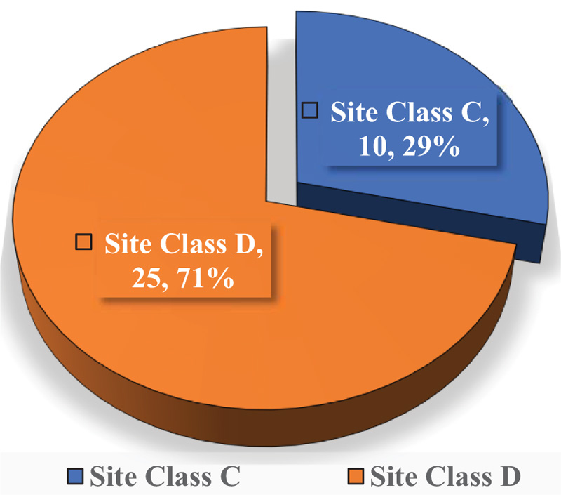 In line with the variations of geological and local site conditions, site investigation data is collected from previous studies by Mase et al. [2], Mase [8, 9]. In Fig. (2), the site investigation points are indicated by yellow-red circles, namely L1 to L35. Several site investigations are conducted at those points, including boring-long, and shear wave velocity measurements. Mase et al. [2], Mase [9] summarised the typical sub-soils in Bengkulu City as presented in Fig. (3). As presented in Fig. (3), there are five main layers as typically composed layers in Bengkulu City. The first layer is known as the clay layer, dominated by organic clay and high-plasticity clay (OH-CH); the thickness of the layer is about 1 to 3 m with Vs of about 94 to 241 m/s. This layer is followed by silty clay (CM) with a thickness of about 1 to 7 m and Vs of 165 to 353 m/s. The third layer is dominated by mixed sandy soils classified as silty sand (SM), poor-graded sand (SP), and clayey sand (SM). This sand layer has a thickness of 1 to 15 m and Vs of 466 m/s. Dense sand layers dominated by well-graded sand (SW), clayey sand (SC), and clayey gravel (GC) are noted as the fourth typical layer in Bengkulu City. This layer has a thickness of 1 to 20 m with Vs of 408 to 614 m/s. At the bottom, a rock layer categorised as sandstone is generally found. This layer has Vs of 476 to 760 m/s and it is recorded as an engineering bedrock surface in Bengkulu City. Several studies conducted by Mase [4] and Mase [9] mentioned that the depth of engineering bedrock in Bengkulu City generally varies from 30 to 50 m depth below the ground surface. Fig. (4) shows the time-averaged shear wave velocity for the study area's first 30 m (Vs30). It can be observed there are seven classes of Vs30 in the study area. The minimum Vs30 in the study area is 235 m/s, and the maximum one is 507 m/s. Fig. (4) also shows that Vs of 274 to 313 m/s is dominant in the study area. Based on the Vs30 distribution, Fig. (5) shows the distribution of Site Classification in the study area. Fig. (5) shows that most sites are categorised as Site Class D according to National Earthquake Hazard Reduction Program [25]. Site Class D is assigned for sites with Vs30 of 180 to 360 m/s, whereas Site Class C is assigned for sites with Vs30 of 360 to 760 m/s.