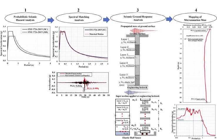 Fig. (6) presents the research framework of this study. There are four steps that are conducted to achieve the objective of this study. The first step is probabilistic seismic hazard analysis, the second step is spectral matching analysis, the third step is one-dimensional seismic ground response analysis, and the last step is seismic micro-zonation mapping. First of all, the data had been collected from previous studies. In this research, two relevant studies conducted by Mase [8, 9] are referred. In those studies, site investigation data, geological maps, and seismotectonic information are collected. The main goal of this study is to compose a seismic microzonation map considering probabilistic seismic hazard analysis in which the Government of Indonesia had released the results through SNI 1726:2019 [7].