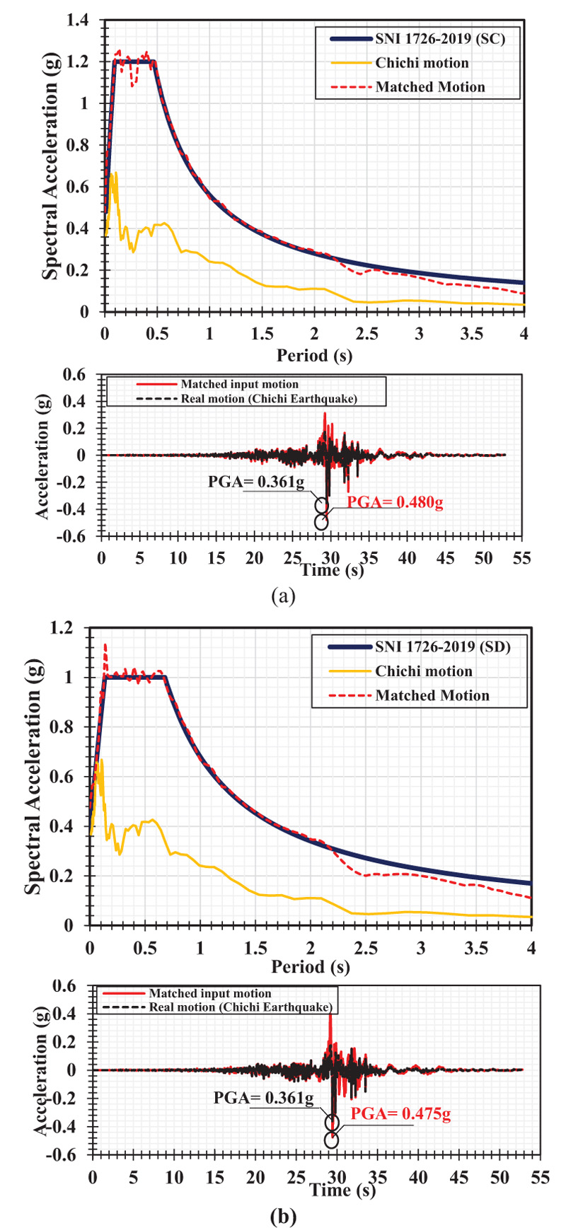 The next step is to conduct a spectral matching analysis (STEP 2). The spectral acceleration design based on SNI 1726:2019 is used as target spectra in the analysis. This study uses the spectral matching method from Hancock et al. [27]. The matched spectral can be obtained from the analysis and transferred into waveform analysis considering the relevant ground motion in the study area. A study conducted by Mase [4] elaborated that the Chichi earthquake motion could be one of the relevant ground motions for Bengkulu City since the most common earthquake type in Bengkulu City is generally a subduction earthquake triggered by the activity of Sumatra subduction. Therefore, the synthetic ground motion derived from spectral matching analysis is generated from matched spectral acceleration and Chichi input motion.