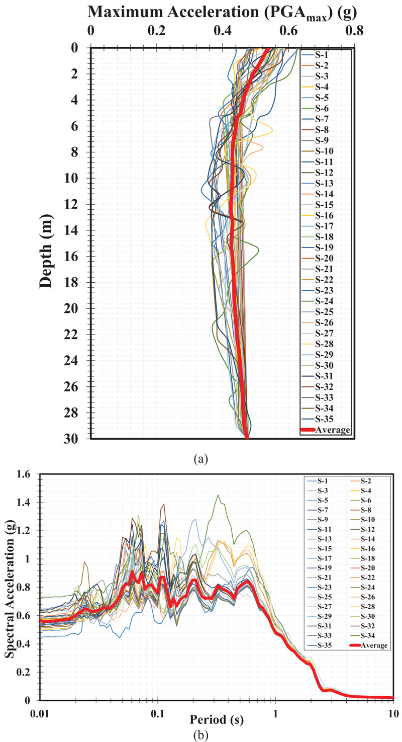 Afterward, a one-dimensional seismic ground response analysis is conducted to simulate seismic wave propagation (STEP 3). The wave is applied to engineering bedrock and propagated up to the ground surface. According to Mase [4, 8] the position of engineering bedrock in Bengkulu City is generally found from 30 to 50 m depth. Therefore, for engineering practice, the engineering bedrock surface at 30 m is generally and commonly implemented in Bengkulu City [8, 15, 34]. Engineering bedrock surface is indicated by Vs of 760 m/s [46, 47]. In this research, software called DEEPSOIL from Hashash et al. [11] was used. Several ground motion parameters at the ground surface, such as peak ground acceleration (PGA), spectral acceleration at 0.2 s and spectral acceleration at 1.0 s, and amplification factor (AF), are collected.