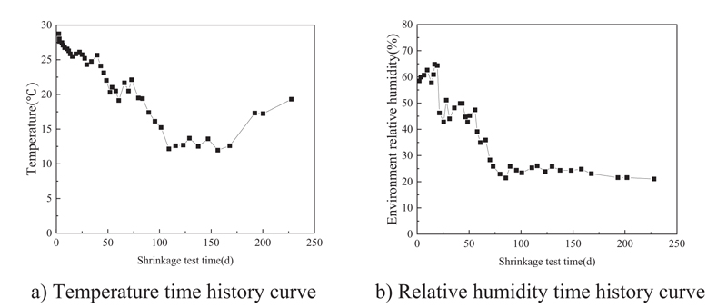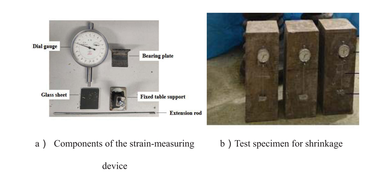The shrinkage test was carried out according to GB/T 50082-2009 “Standard of test method for long-term performance and durability of ordinary concrete” [16]. Two sets of strain collection devices were placed on the opposite sides of concrete prisms, the distance between the two measuring points in the strain collection device was 200mm, three concrete prisms in each strength grade were tested for shrinkage, and the mean shrinkage of the three concrete prisms was recorded as the shrinkage value of the group of concrete specimens (Fig. (4).