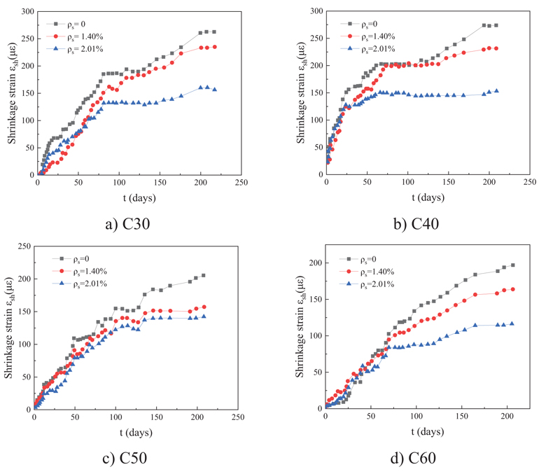 Fig. (5) shows the shrinkage time history curve of the reinforced concrete specimen from the beginning of the experiment. ρs in Fig. (5) is the total reinforcement ratio of longitudinal reinforcement. The shrinkage strain of reinforced concrete specimens decreased with an increase in the longitudinal reinforcement ratio. At the end of the shrinkage test, the contraction strain of the 1.40% specimen with longitudinal reinforcement ratio was reported to be 76%~89% of that of plain concrete, and the contraction strain of the 2.01% specimen with longitudinal reinforcement ratio was 52%~76% of that of plain concrete. It can be concluded that longitudinal reinforcement inhibited the development of free shrinkage, and the higher the reinforcement ratio, the more pronounced the inhibition effect.