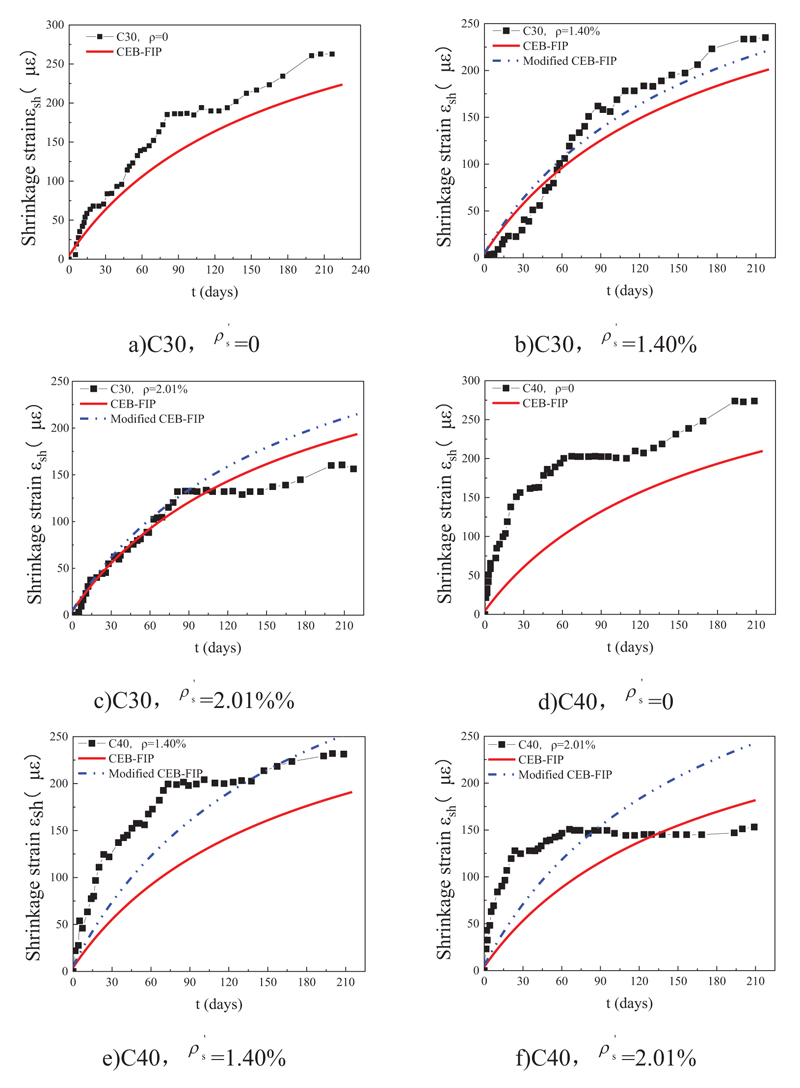 The comparison between the existing reinforced concrete specimen shrinkage model and the test values is shown in Fig. (6). It can be seen that the prediction accuracy of the existing reinforced concrete specimen shrinkage model is high when the strength is higher, but the prediction effect is worse when the strength is lower. Taking the longitudinal reinforcement ratio of 1.40% as an example, when the shrinkage test time is 210d, the ratio fractions of calculated values and test values of C30, C40, C50 and C60 reinforced concrete specimens are 83.8%, 81.7%, 116.4% and 95.80%, respectively.