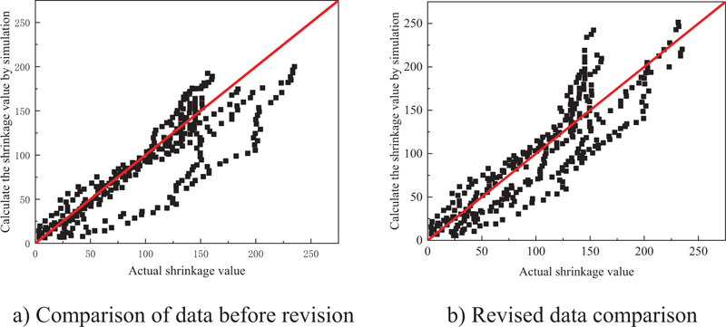 Table 5 shows the specific comparison of prediction accuracy between existing and modified reinforced concrete specimen shrinkage models. It can be seen that the R-value predicted by the revised RC specimen shrinkage model is higher than the existing reinforced concrete specimen shrinkage model, while the MSE, MAPE and IAE are smaller than the existing reinforced concrete specimen shrinkage model. Fig. (7) compares the predicted value of the existing reinforced concrete specimen shrinkage model and the modified reinforced concrete specimen model with the experimental value. It can be seen that for the existing reinforced concrete specimen shrinkage model, most of the experimental data points fall at the lower side of the Y=X line, indicating that the existing reinforced concrete specimen shrinkage model underestimates the reinforced concrete specimen shrinkage on the whole. For the modified reinforced concrete specimen shrinkage model, the data points are evenly distributed on both sides of Y=X, indicating that the modified model can accurately predict the reinforced concrete specimen shrinkage.