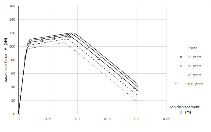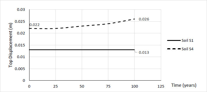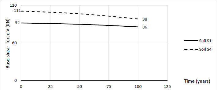 The top displacement at the performance point of the structure increases over time in the case of loose soil. Fig. (5). This increase is around 11% at 100 years compared to the initial state. While the displacement in the case of rocky soil is almost constant (D = 1.3 cm), whatever the age of the structure.