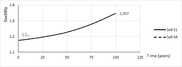 Building ductility does not depend on soil type. It increases from 1.174 to 1.347 (+ 15%) in the two cases of soil S4 and soil S1. Fig. (6).