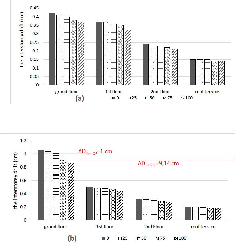 Where: h: interstorey height and K: the behaviour factor k = 3.2. In the case studied, the limit displacement at the ground floor is: ∆DlimGF=1cm, and the limit displacement at the storey is: ∆DlimSt=9.14 cm.
