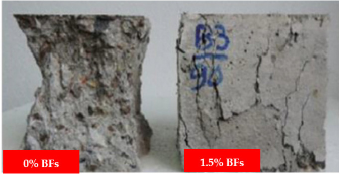 In another study [32], the compression test failure mode for cubes was shown as illustrated in Fig. (2). The development of significant fissures over their whole length caused a cube specimen made of plain concrete to collapse. In contrast, adding BFs to the concrete failed because of the formation of small, thin fissures on their surfaces. This demonstrates how well the BFs and concrete matrix adhere to one another. Similar results have been reported by another study [33]. The amount of chopped BF and fiber dispersion affected the fc of BF concrete. Due to the periodic hoop effect, the standard concrete cube sample fractured with a loud noise as its weight increased. Fig. (2) shows the failure mode of normal concrete. Another study showed that cracks in simple concrete samples started forming at sloped locations and continued to grow until they eventually cracked.