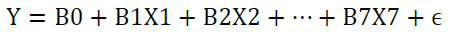 where Y is the dependent variable, B0is the intercept, and B1, B2…, B7 ​ are the coefficients of the independent variables X1, X2,, X7, and ϵ is the error term [12]. Support Vector Regression (SVR) was used to develop a model using a linear kernel function. The orange program contained different types of kernel functions (polynomial, linear, sigmoid, and Radial Basis Function RBF), as shown in Table 3 [48].