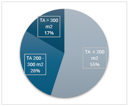 It is obvious that project one, P1, had the highest percentage of data sets at 23%, while P8, P9, and P10 had the lowest data rate. Fig. (2) indicates that the most built type in housing projects is those with areas of 200 square meters or less. The percentage of units ranging from 200 to 300 has a smaller number of areas (less than 200 square meters. The big housing units represent only 17% of the houses in these projects. This resulted in the most desired housing unit area of 200m2 or less. Fig. (3) illustrates the NAR for different classifications of total area.
