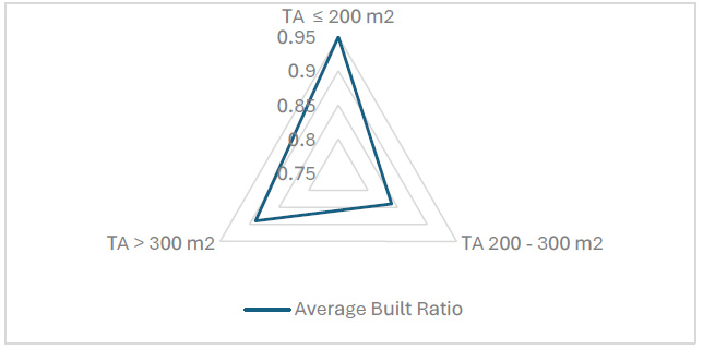 Based on Fig. (3), the ratio of the building area to the total area of ​​houses with an area of ​​200 square meters or less is relatively higher in smaller areas. These results are logical, as in small areas, the spaces left for entertainment purposes, such as parking, are usually fewer than those found in houses with large areas. Houses with 200–300 m2 areas showed the lowest average built ratio. This ratio represents the area utilization of residential units. Most housing units in this study had a ground and first floor or a ground and half first floor. After checking and reviewing the data, the data containing the variables were tabulated for modelling.