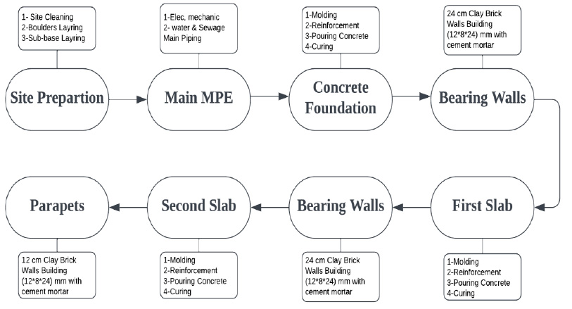 An interview was conducted with three contractors specializing in construction to calculate the value of project delays. This interview aimed to adopt the real productivity values for each working team to calculate the optimal period for implementing each task. Thus, we calculated the time required to complete each house model, compared it with the period implemented, and found the difference between them. Fig. (4) shows the sequence of structural tasks for landed housing units.